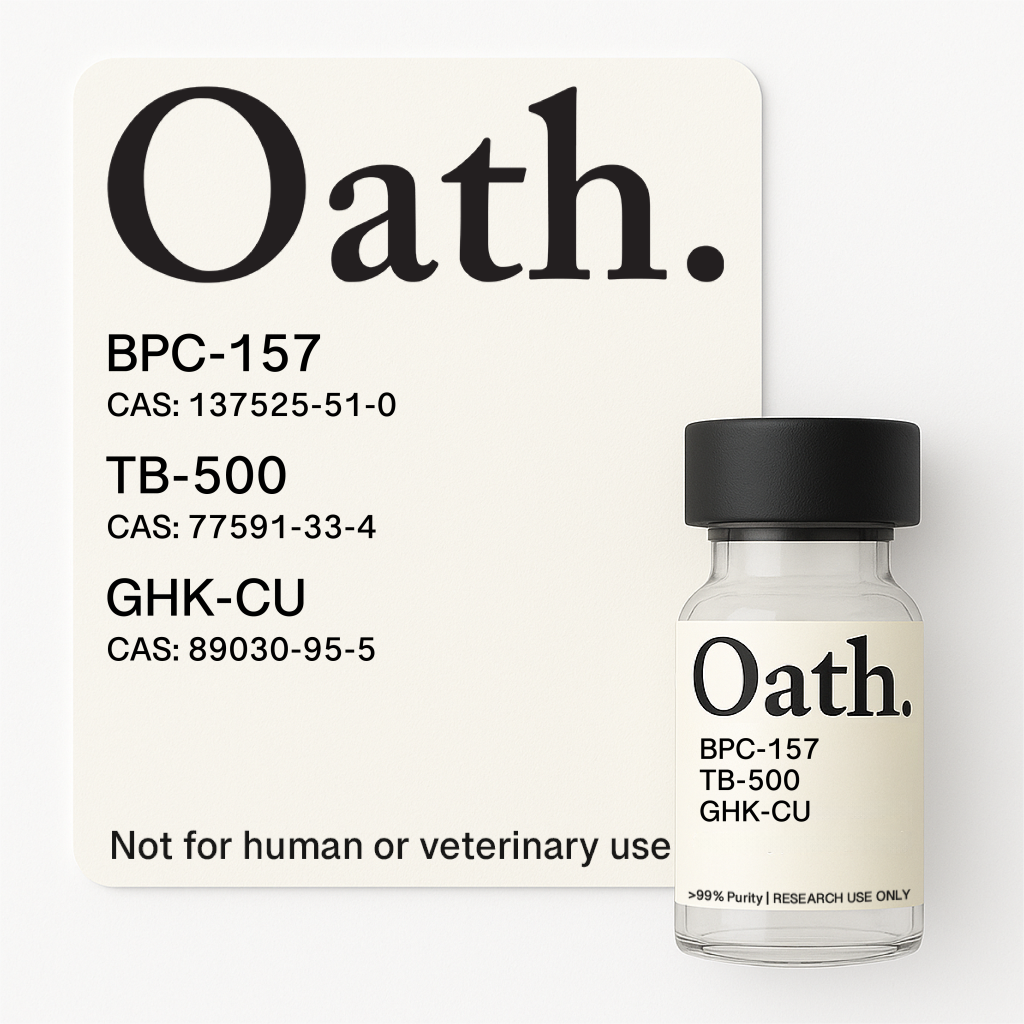 GLOW is a three-component peptide blend containing BPC-157, TB-500, and GHK-Cu. BPC-157 (5mg) is a pentadecapeptide — 15 amino acids long — synthesized from a partial sequence of a protein found in human gastric juice. Its molecular formula is C₆₂H₉₈N₁₆O₂₂ with a molecular weight of approximately 1419 g/mol. TB-500 (10mg) is a 43-amino-acid synthetic fragment of thymosin beta-4, a protein expressed in nearly all animal cell types. GHK-Cu (35mg) is the tripeptide glycyl-L-histidyl-L-lysine complexed with a copper(II) ion, first isolated from human blood plasma by Dr. Loren Pickart in 1973.